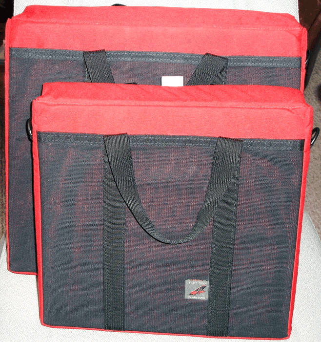 Over the years, I've bought for myself and my family: at least two pre-ID messenger bags, the DewDrop waist pack (sorry, no longer available, and I use mine all the time), his largest duffel bag (another thing I'm sorry to say he no longer makes), the Eclipse, a Brain Bag, a kid-sized back pack he no longer makes, the Buzz, a large Café Computer Bag, a Miter, four Brain Cells of various sizes, a bunch of accessories like the Snake Charmer, a wallet, and these cool battery pockets he used to make ... and of course the Super Ego. Tom Bihn bags last forever, so when you change computers, you can end up with left-overs. I have a Crimson Brain Cell for the 12 inch iBook, and no iBook anymore. I also have a matching Miter for the same machine. Both good as new. Both looking for a home.