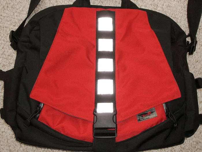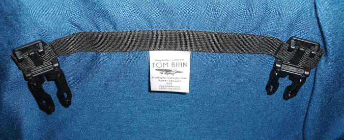 The flap covers a smaller, though still spacious, front pocket, whose back wall has dimensional slots for hand-held size things (2) and pens, pointers or other like sized objects (3), plus one sometimes-handy smaller flat pocket that happens to nicely fit a thumb drive or Leatherman. A pair of small D-rings attached to the back wall just under the flap, one at each end of the big pocket, provide a handy place to clip keys or other sundries on supplied webbing clip-straps. This front flap is held down by a single central buckle. The buckle and vertical strap attaching it to the flap are replaceable. You can choose strap color and fabric, traditional buckle or seat-belt style buckle, and change to fit your mood (though swapping out is a little bit of work: the strap is held to the flap with Aplix and a webbing ladder). The seat-belt buckle is a nice touch, though a little heavy. I'm currently using the standard buckle and reflective-tape strap.