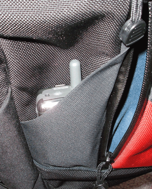 Underneath the flap, on the front of the bag (i.e., outside the big front pocket), there are, symmetrically arranged, six more pockets. Working from the center towards the edges, they are: a pair of simple slanted open pockets, not unlike the front pockets on a pair of pants; behind those, somewhat more spacious pockets that close with vertical splash-proof zippers, and finally narrow stretch-mesh slots with deep slash openings, perhaps appropriate for a cell phone. Because the buckle is at the center, these pockets are all accessible just by lifting a corner of the front flap. Since these slash pockets don't zip, snap, or velcro closed, I only put my phone there when I'm on foot. On a bike or other angularly-less-predictable mode of transportation, the phone goes deeper under the flap. Each of those vertical zip pockets is large enough to hold at once: an Airport Express, the power brick for my Mac, a few international adapters, and 10 meters of Cat-6. When fully stuffed, though, don't expect to get much in the matching outside slot pocket that forms its front wall.
