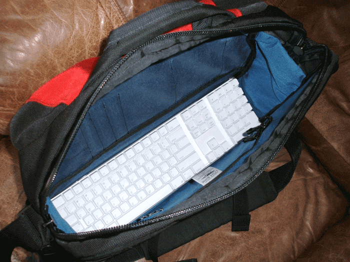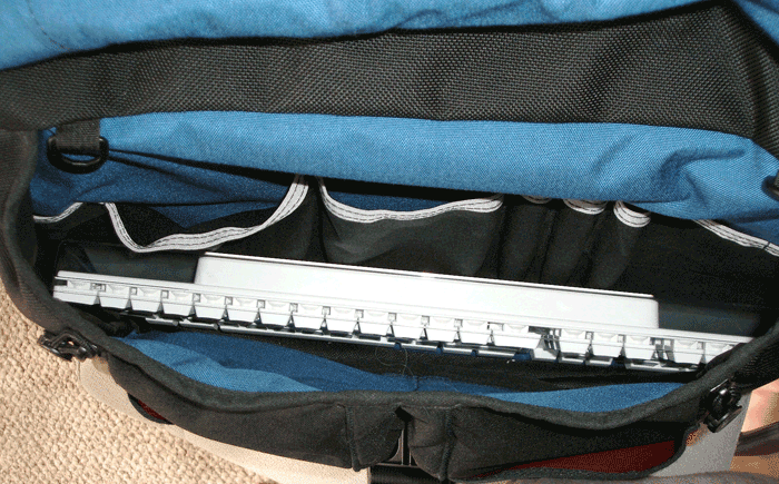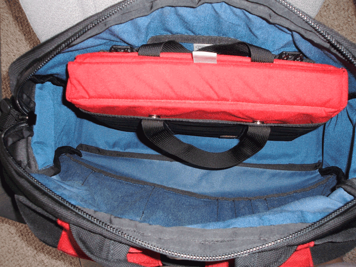 I'm not sure I can do this bag justice, but if I start with the features, maybe the adjectives will come of their own volition. This is a cavernous bag that can easily swallow more than you would actually want to lift. The main compartment has clips to hold a Brain Cell, of course, and is accessed through a Uretek splash-proof zipper across the top of the bag. No flaps, buckles, or straps come between you and the central storage area. Just unzip, and you're in. This is the meat and potatoes feature of a messenger bag. This main compartment has no dividers or pockets. It's all open space. Without a computer, I can fit about three days worth of clothes there (and my clothes are big). With the giant AlienWare and Brain Cell in place I can fit the better part of two days worth of clothes (translation: not including pants), and (with one of those squeeze-the-air-out plastic packing bags) my winter coat.