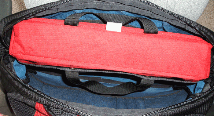The Brain Cell is the inner fortress that protects your laptop, and comprises three layers of defense. At the innermost, your laptop hangs, suspended in an 8mm-thick hammock of soft foam padding. A significant gap prevents your computer from `touching bottom'. This sling hangs from a 4mm-thick strong-as-hell corrugated plastic insert (totally hidden) that provides both structure and protection for the front, back, and bottom. The sides are then protected by a sewn in, dense, cross-linked, closed-cell, polyethylene foam. Finally, the outer layer is 500 denier Cordura. Hopefully Tom will forgive me for linking to his images. Here's his cut-away view: